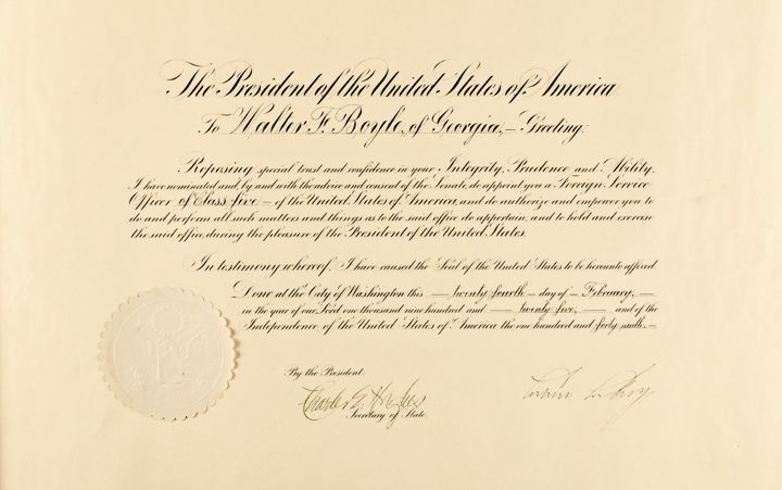 February 24, 1925-Dated, Partially-Printed Document Signed, “Calvin Coolidge” as President, 1 page, measuring 23” x 19” at Washington, DC, Choice Crisp Near Mint. This is an official Presidential Appointment for “Walter F. Boyle, of Georgia” to serve as a “Foreign Service Officer of Class five.” Countersigned by “Charles E. Hughes” as Secretary of State. Magnificent Federal Embossed White Paper Seal being distinct and fully intact. There is one small corner handling crease in the bottom left and a vertical crease at left that should hardly be noticed once properly matted and framed for display. A lovely quality, fresh Document boasting a huge crisp 3.75” long “Calvin Coolidge” signature.