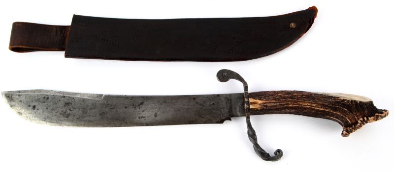 Very good condition blade with maker stamp, stag horn handle with later leather scabbard, overall length 19 inches.