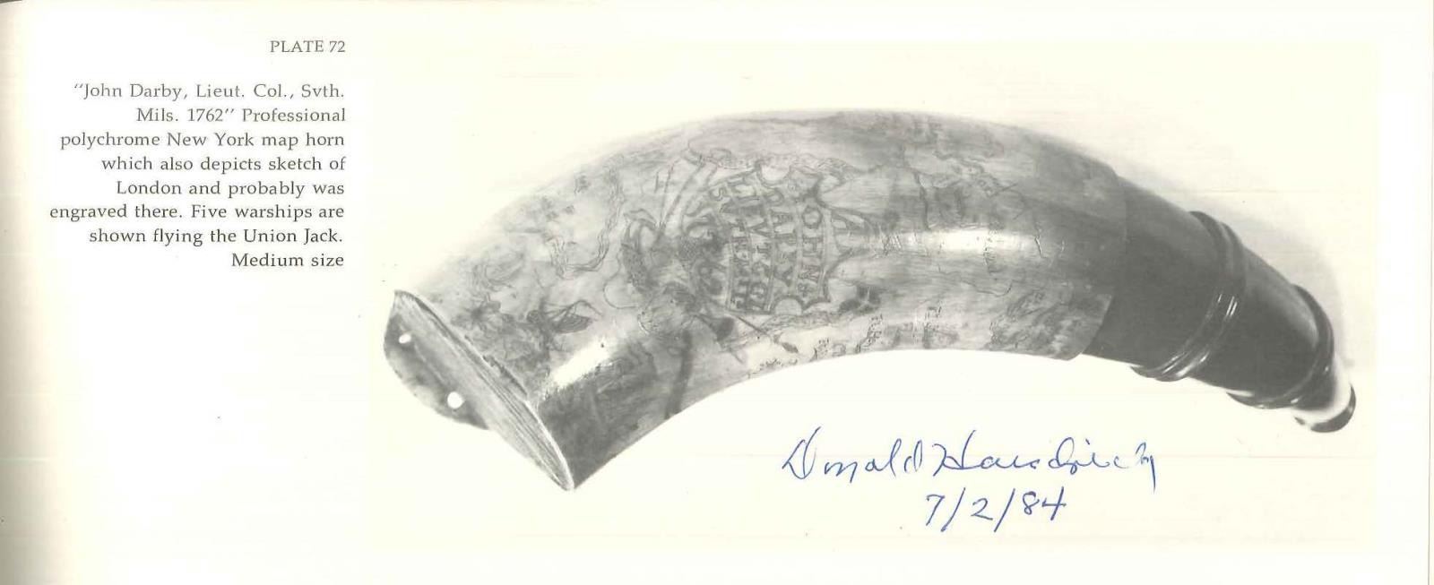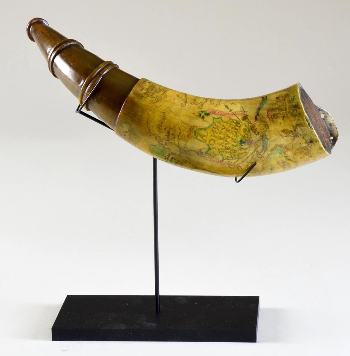 This exact horn is pictured in John Dumont’s American Engraved Powder Horns, 1978. 12” overall. This professionally carved horn has superior artistic detail and addition of colors & fine surface make this a remarkable piece of historic art. The central panel of shield: “JOHN / DARBY /LIEUt COL / AD 1762” above a panoply of arms, British flags, lion. New York City is shown w/ ships in the harbor w/ British flags, all the normal cities along the rivers, Albany, Schenectady and Half Moon Tavern, and the various forts, many with interesting dialectic spellings. A large British coat of arms is topped with a vignette of London with ribbon reading “BRITANIA”. “Carrick” signed at the top is thought to be name of the professional carver of this horn. John Darby was a career British officer like his father & his son. He entered service with the 17th Regiment of Foot as a Captain in November of 1748. He became Major to the regiment in 1756 landing in Halifax with Col. John Forbes. He became Lieutenant Colonel in 1759, retiring in 1775. John Darby thus commanded the regiment for much of the Seven Years War, Pontiac’s Rebellion, and for its peacetime postings until the eve of the American Revolution. His father, John Darby, had served the Duke of Marlborough for over 36 years retiring as a Major. His son, William John Darby, also a career military officer who served throughout the Revolutionary War, was captured at Cowpens, later exchanged & returned to England in 1783. REFERENCE: pictured page 55, plate 72 John Dumont, America Engraved Powder Horns, 1978. UNATTACHED ACCESSORIES: scan copy of book excerpt. CONDITION: very good overall as cleaned, good discernible scrimshaw with faded colors, few small insect holes, retains lanyard holes in lobed extension. Plug has old age crack. PROVENANCE: Ex-Wester A. White Collection; Ex-Donald Handrick Collection. From the Collection of John "Tim" Breth Jr. (02-13786/JS). $4,000-6,000.