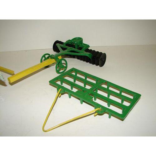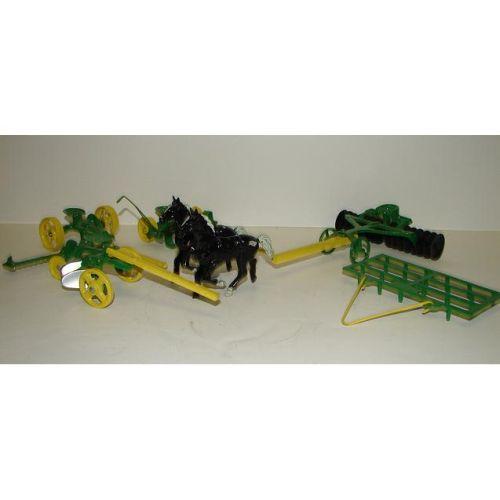 JOHN DEERE FARM TOY SET. Consists of a horse-drawn disc (7.25” L), horse-drawn planter (7” L), horse-drawn sickle-bar mower (7” L), horse-drawn two bottom plow (7” L), horse-drawn spike drag (5” L), and two horses. From the Coleman Wheatley collection.