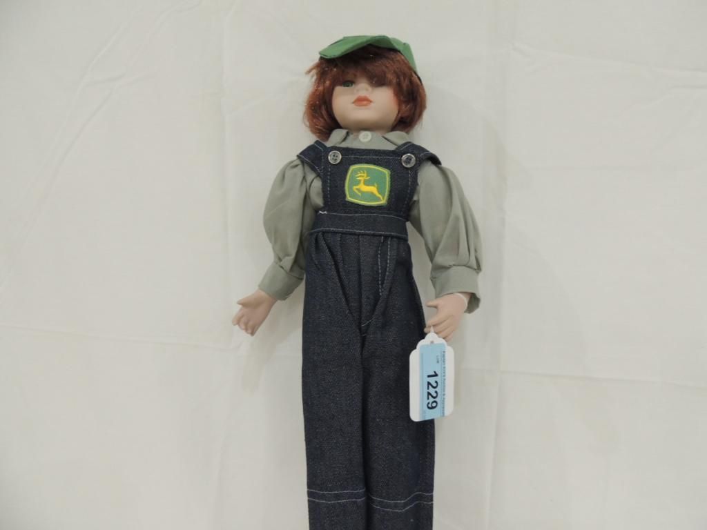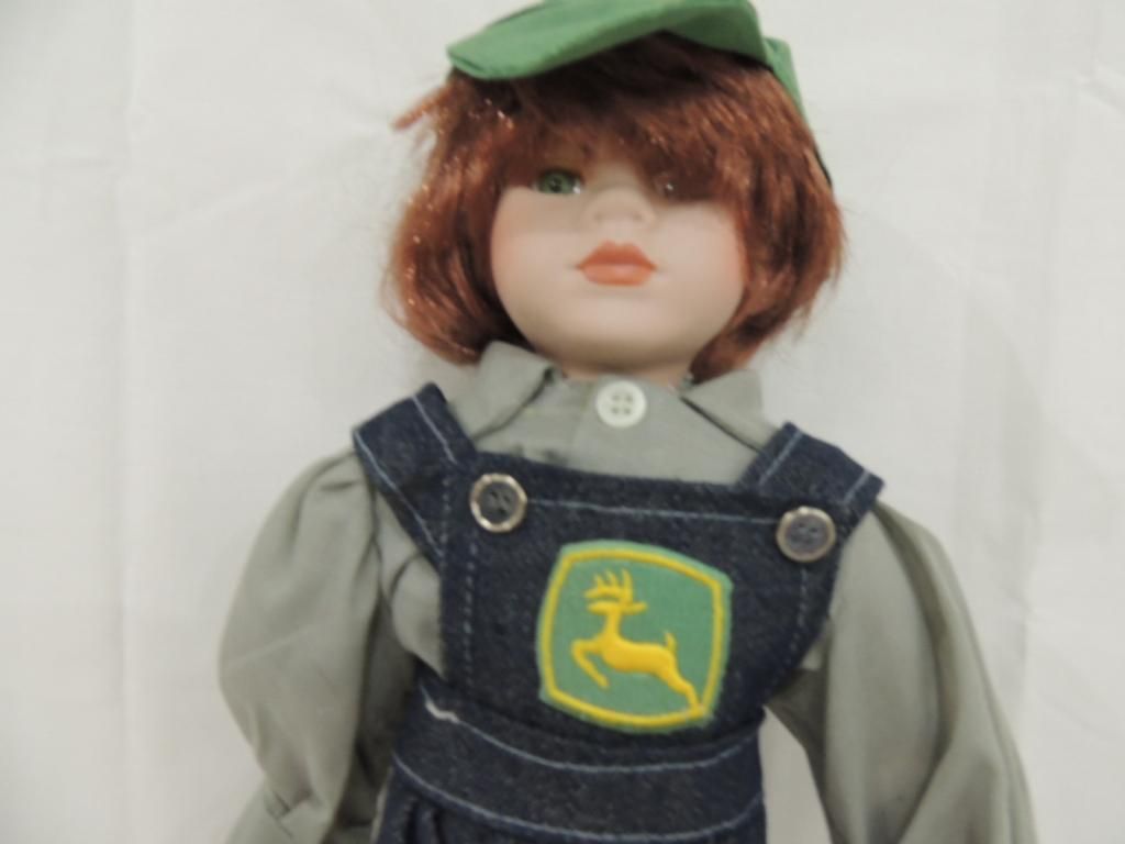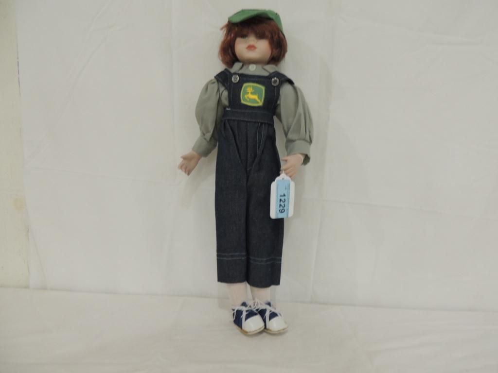 JOHN DEERE PORCELAIN DOLL IN OVERALLS AND HAT. 21" TALL AS SHOWN. SEE PHOTO FOR MORE DETAILS.