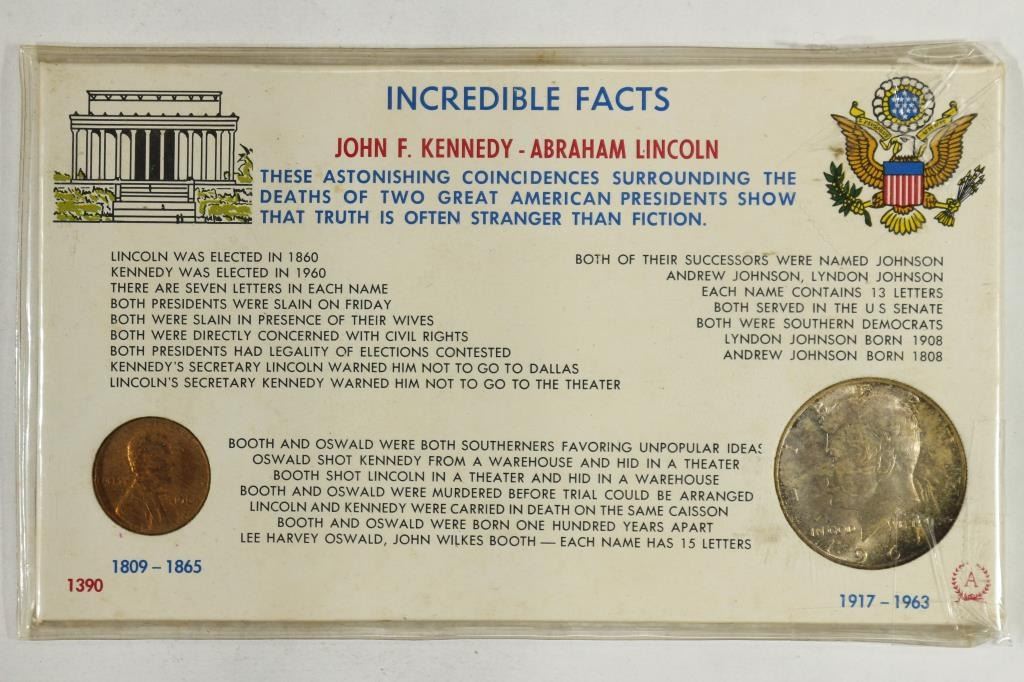 FACTS CONTAINS: 1964 90% SILVER KENNEDY HALF DOLLAR AND LINCOLN CENT ON CARD WITH FACTS
