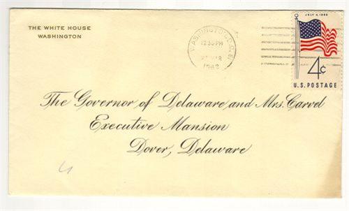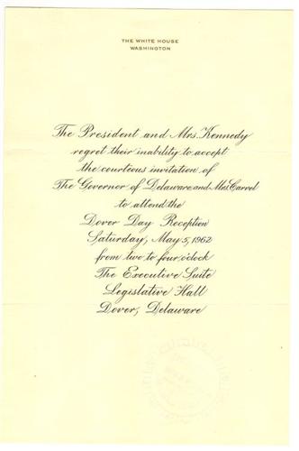 JOHN F. KENNEDY INVITATION RESPONSE.  6.125" x 9.25" White House stationary, Washington, D.C.  Response reads "The President and Mrs. Kennedy/regret their inability to accept/the courteous invitation of/The Governor of Delaware and Mrs. Carvel/to attend the/Dover Day Reception/Saturday, May 5, 1962/from two to four o'clock/The Executive Suite/Legislative Hall/Dover, Delaware".  Comes with original envelope addressed to "The Governor of Delaware and Mrs. Carvel/Executive Mansion/Dover, Delaware" and postmarked March 27, 1962.  Reverse of response is stamped "Received/Mar 28, 1962/Governor's Office".