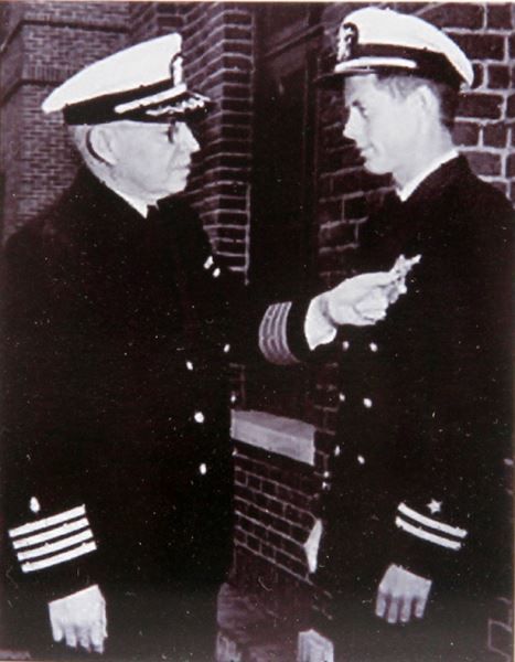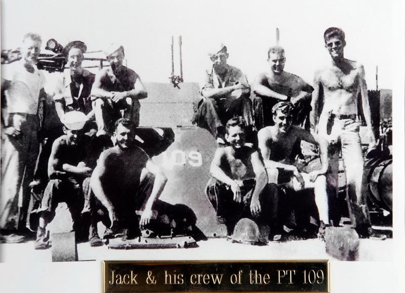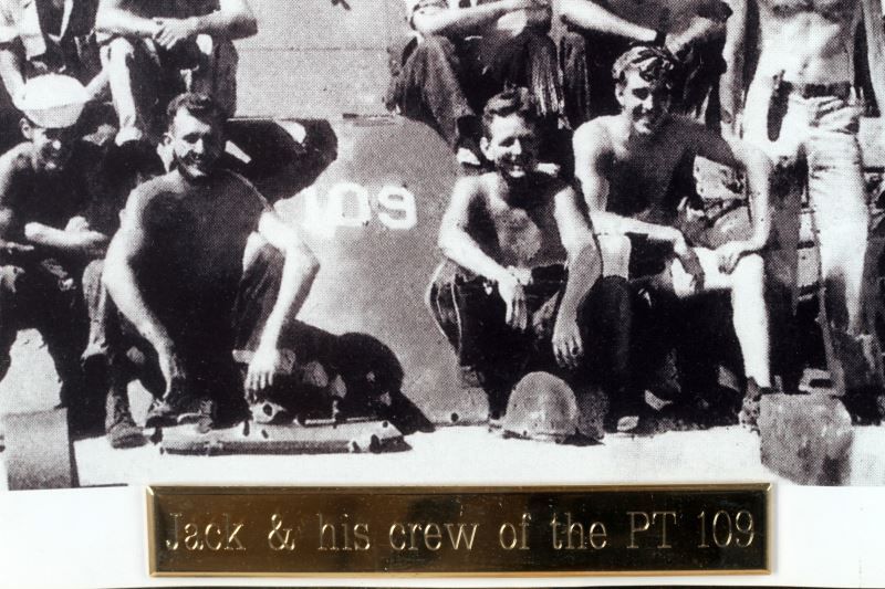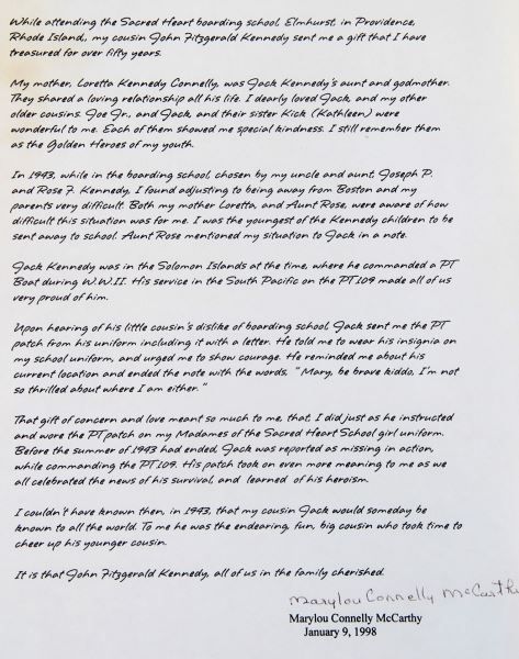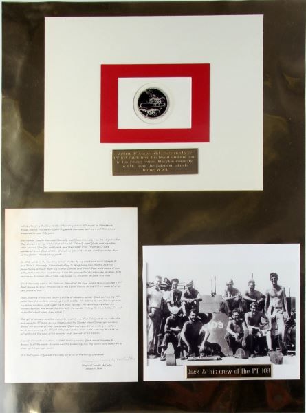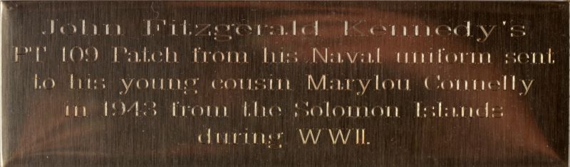 Patch with accompanying letter from JFK cousin Marylou Connelly McCarthy, also copy material of Kennedy with PT-109 crew, Kennedy receiving the Navy & Marine Corp medal for Gallantry and a patch from the Carrier USS Kennedy CV 67, the grouping is framed 27 by 39 inches. The letter written in 1998 by Ms. McCarthy details her close relationship with Jack, Joe Jr. and sister Kathleen, it further details her being sent away to boarding school and her sadness in having been sent to Madames of the Sacred Heart Boarding School, JFK corresponded with her explaining he was none too happy of his location either, two paragraphs read, " Jack Kennedy was in the Solomon Islands at the time where he commanded a PT Boat during WWII. His service in the South Pacific on the PT-109 made us very proud of him. Upon hearing of his little cousin's dislike of boarding school, Jack sent me the PT patch from his uniform including it with a letter. He told me to wear his insignia on my school uniform and urged me to show courage. He reminded me about his current location and ended the note with the words "Mary, be brave little Kiddo, I am not so thrilled about where I am either". The patch is period correct, it is an unauthorized patch worn by enlisted crewman on the dress blue uniform on the left sleeve above rank insignia, beneath the patch a brass plaque describes this patch as being worn by Kennedy, it was clearly owned by Kennedy and it is documented they were often given as gifts, but being an officer, it would not have been worn as it is strictly an Enlisted patch only. A well provenanced piece of Kennedy memorabilia. This lot has a reserve.