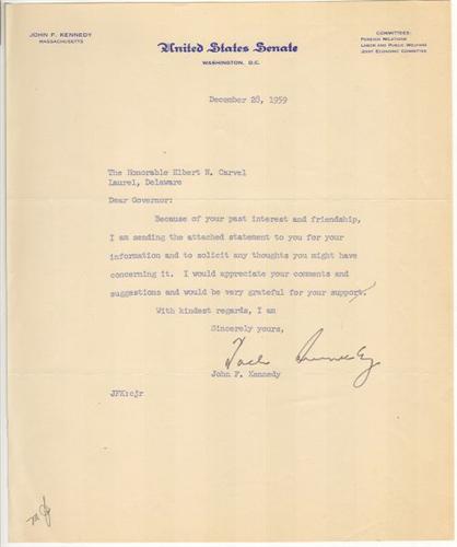 JOHN F. KENNEDY TYPED LETTER SIGNED.  Typed letter boldly signed "Jack Kennedy", on 8" x 10.5" United States Senate stationary, Washington, D.C., December 28, 1959.  Note to the Honorable Elbert N. Carvel (Governor of Delaware 1949-1953, 1961-1965) citing their friendship and asking for his thoughts on an attached (not included) statement.  Shows slight bend at bottom left.  Initialed MJS at bottom left.