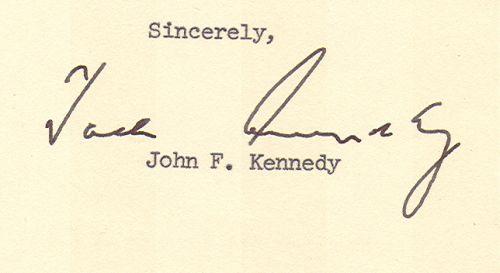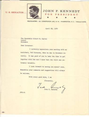 JOHN F. KENNEDY TYPED LETTER SIGNED. Typed letter boldly signed "Jack Kennedy", on 8.5" x 11" John F. Kennedy For President stationary, Washington, D.C., April 22, 1960. Note to the Honorable Elbert N. Carvel (Governor of Delaware 1949-1953, 1961-1965) expressing his appreciation for meeting with his assistant, Ted Sorensen, when he was in Delaware. Shows bend at top right and slight bend at bottom left with small .25" tear.
