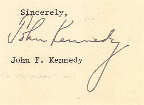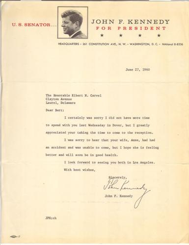 JOHN F. KENNEDY TYPED LETTER SIGNED.  Typed letter boldly signed "John Kennedy", on 8.5" x 11" John F. Kennedy For President stationary, Washington, D.C., June 27, 1960.  Note to the Honorable Elbert N. Carvel (Governor of Delaware 1949-1953, 1961-1965) apologizing for not being able to spend more time with him on Wednesday, June 22, 1960 when he was in Dover.  Note also expresses Kennedy's appreciation for Carvel attending the reception.  Shows minor rolling at both sides and some slight bending to bottom right corner.