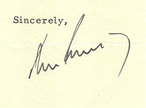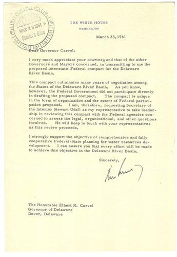 JOHN F. KENNEDY TYPED LETTER SIGNED. Typed letter boldly signed "John Kennedy", on 7" x 10.25" White House stationary, Washington, D.C., March 23, 1961. Note to Governor Elbert N. Carvel (Governor of Delaware 1949-1953, 1961-1965) expressing his appreciation for transmitting the interstate-Federal compact for the Delaware River Basin. Note also lets Gov. Carvel know that Kennedy will be appointing Secretary of the Interior Stewart Udall as his representative for the compact. Stamped at top left "Received/Mar 29, 1961/Governor's Office".