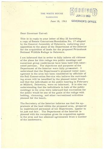 JOHN F. KENNEDY TYPED LETTER SIGNED.  Typed two-page letter boldly signed "John Kennedy" on 7" x 10.25" White House stationary, Washington, D.C., June 18, 1963.  Note to Governor Elbert N. Carvel (Governor of Delaware 1949-1953, 1961-1965) replying to Carvel's letter dated May 22, 1963 furnishing a copy of Senate Concurrent Resolution No. 17 adopted by the General Assembly of Delaware, endorsing Carvel's opposition to the plans of the Department of the Interior for the acquisition of lands for the proposed Primehook National Wildlife Refuge.  Kennedy states that two public meetings have been held to inform the public of the Department of the Interior's objectives.  Kennedy also states that appraisals for the land are just and fair.  Kennedy finally asks Carvel if he will find it possible to retract his objections.  Numerous staple holes at top left and top center.  Stamped at top right on first page "Received/June 19, 1963/Governor's Office".