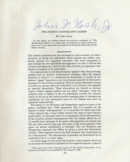 (b. 1928) Nobel Prize winner and subject of the film A Beautiful Life, Nash is an American mathematician whose works in game theory, differential geometry, and partial differential equations have provided insight into the forces that govern chance and events inside complex systems in daily life. Printed D.S., 13pp. 4to., [n.p., ca. 1950], his mathematical paper "Two Person Cooperative Games" boldly signed at the top of the first page. Fine.