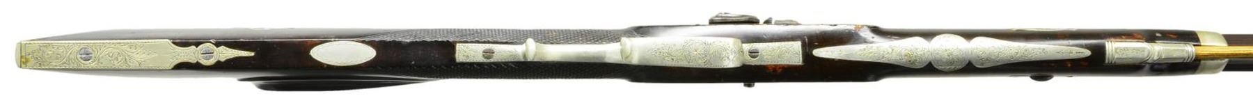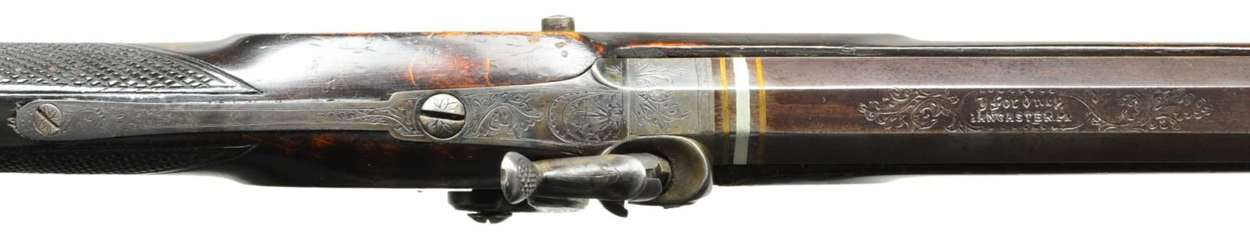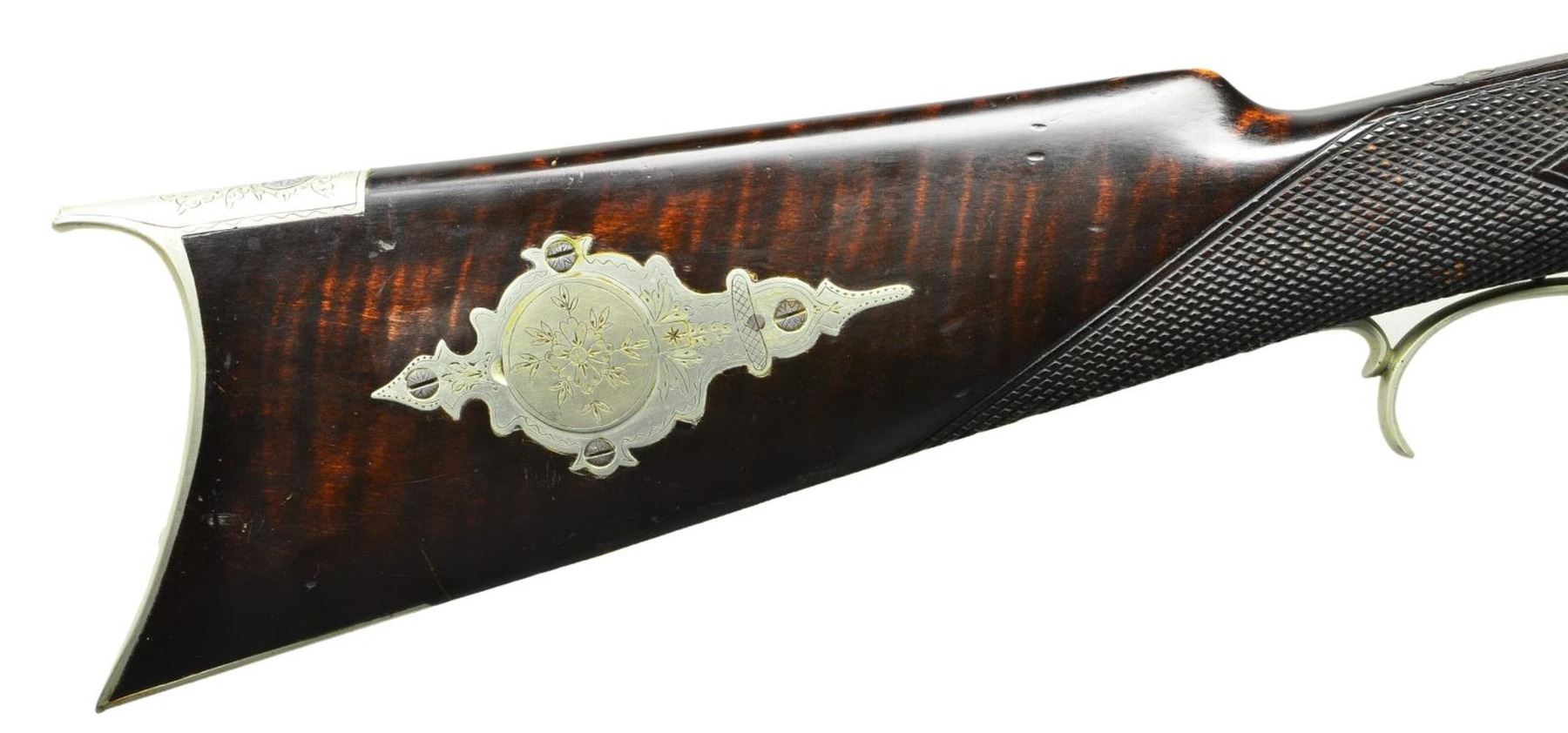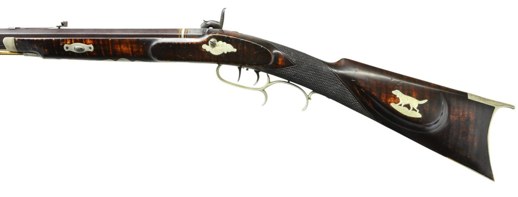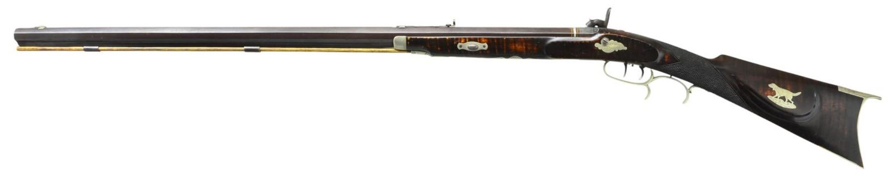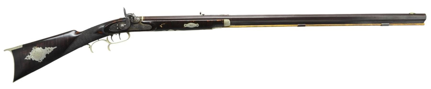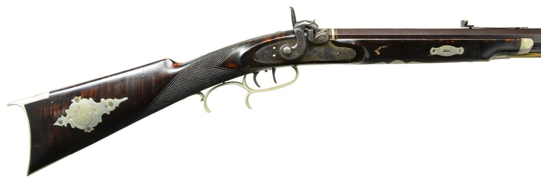 KENTUCKY RIFLE. Cal. 32. NSN. Bbl. 31" full oct. rifled & signed "J. Fordney LANCASTER, PA." The percussion lock is finely engraved & is marked "J Fordney LANCASTER, PA". The stock is nicely checkered at the wrist & has 5 silver inlays. The cheek piece inlay is a silver engraved dog & the silver sideplate is also nicely engraved. The rifle has a 4-1/2" long silver engraved toeplate, a silver engraved trigger guard, a silver engraved ramrod entrance pipe & a 6-1/4" silver engraved saddleplate. In addition, the cap box is also excellently engraved silver. This is an outstanding example of the workmanship of little known gunsmith John J. Fordney who was located at 528 North Duke Street from 1875-1876 (where he was located when this gun was made). He later was listed as a gun & locksmith at 22 West King Street in Lancaster, PA from 1899-1900. CONDITION: the rifle is in extremely excellent condition; however its only flaw being a sm. dent in the stock forward of lock on the right hand side. (01-21206/RG). ANTIQUE. $3,500-6,500.