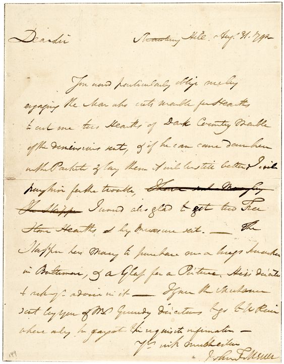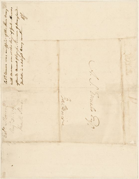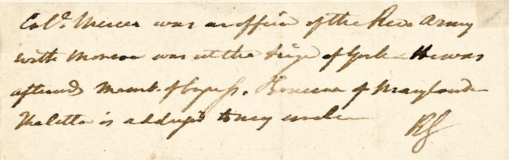 This Letter to a “A. S. Ennals Esq.” in Baltimore, regarding some hearths of "Dark Country Marble" which Mercer wanted to purchase. Docket on the reverse reads: “ Colo. Mercer - Augst 31, 179- Hearth Stone.” Inlaid to an outer paper border for display and reinforcement. Period notation to the right, written in deep brown as an apparent tribute and keepsake regarding Mercer. It reads: “Col. Mercer was an officer of the Army with Monroe was at the Seige of York - He was afterwards Memb. of Congress & Governor of Maryland - The letter is addressed to the sender.”