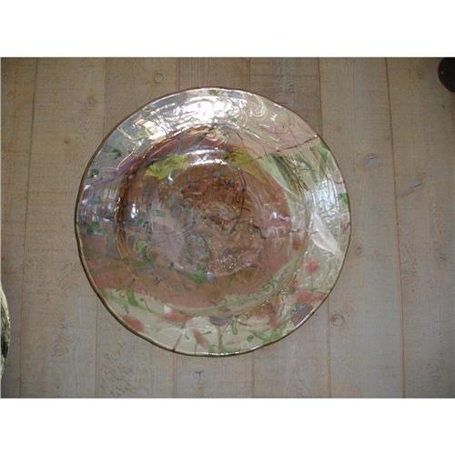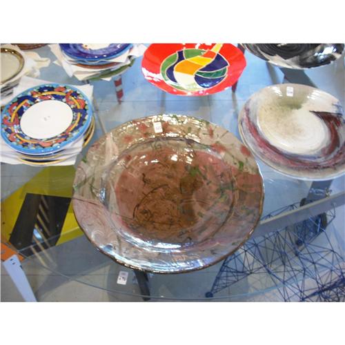 Splash Glazed and Enameled Ceramic Large Charger: Executed in mottled brown, gray and pale rose hues, and detailed in abstract designs. Signed on the foot “Glick.”