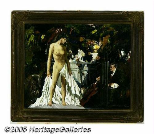 <B>JOHN GRABACH (American 1886- 1981)</B></I><BR>Artist and Model<BR>Oil on canvas<BR>16in. x 20in.<BR>Signed lower right<BR><BR>Condition Report: Original unlined canvas, some overpaint in craquelure above head of artist and left of teapot, minor overpaint along bottom edge and in drapery held by model, minor inpainting in hair of model, signature abraded.<BR><BR>Brian Roughton: Signature not abraded. Overall good, unlined condition. No question of authenticity.<BR>