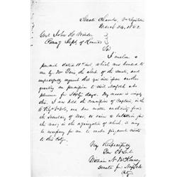 JOHN H. WINDER: (1800 - 1865) Confederate brigadier general and commander of the Confederate Libby Prison, Belle Isle and the notorious prison at Andersonville. He escaped the hangman, dying just before war's end. War-date A.E.S. in pencil on the verso of a letter from William N. McKenney, Senator from Norfolk City, "Senate Chamber VA Legislature", Mar. 24, 1862, requesting permission to visit Norfolk for sixty days. Winder endorses on verso, in full: "give the support subject to military authority at Norfolk Jno. H. Winder Brig". Very good. $200-300