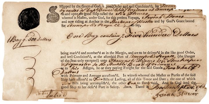“1 Bag of 500 Dollars.” This late French and Indian War period document is a receipt for the transfer and shipping of a bag of 500 (Spanish Milled “Pillar” Dollars) from the Hancock’s Wharf Office to “JOSIAH STOVER.” This money to be transported to “Thomas Williams Esq., StoreKeeper & Paymaster to the Honorable Board of Ordinance ... Port of Annapolis, Royal.”