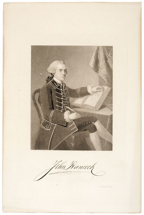 September 30, 1764-Dated, Partially-Printed Shipping Document, at Boston, unsigned, the completed Manuscript Text in the hand of John Hancock, Fine. This original form is printed on early laid period paper, measures 4.5” x 9” with its original black wax seal appearing very distinct in the upper left corner. Some small edge chinks affect some of the manuscript text in the upper right corner. It is even in tone with some deeper tone areas and tipped to a larger sheet. There is very bold, clear rich brown manuscript portions by John Hancock and deep black printed text. It is also accompanied by a circa 1850 Engraved Print of John Hancock with his famous engraved facsimile signature below, 9” x 5” Very Fine. Below the seal is the notation: