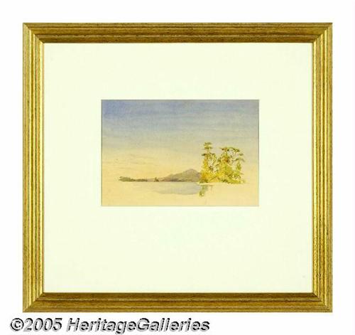 <B>JOHN HENRY HILL (American 1839 - 1922)</B></I><BR>Lake with Trees<BR>Watercolor on paper<BR>6.75in. x 9in.<BR><BR>Condition Report: Paper is yellowed for light exposure, colors are slightly faded, 2 small tears upper left edge, .5in tear center bottom edge, 1in. tear parallel to bottom edge<BR>