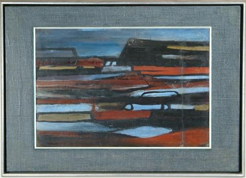 JOHN HULTBERG (American, 1922-) TWO ABSTRACTS. 1) Black and white abstract oil on canvas. Dated on reverse "2 Feb 49in. with typed label affixed to back of canvas "Artist: John Hultberg, San Francisco February 2 1949 Bern Porter Collection of Contemporary Art". Housed in a simple white painted wood frame. Unsigned front. SIZE: 26in. x 22in.. CONDITION: Craquelure with some minor chips. 2) Framed oil on board abstract in blues, blacks and reds. On back in pen "Painted by John Hultberg". Also partial script name, probably by artist. Two newspaper articles. One involving an exhibition in 1985 at Barridoff Galleries, Portland, Maine. Housed in a wood and material lined frame. SIZE: 19in. x 28in.. CONDITION: Vertical crack through right side with two chips on edge. Fair. 9-26108