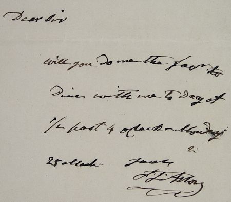 (1763 - 1848) American fur trader and financier, Astor grew to become the dominant fur trader in America and built a fortune from investments in government loans and real estate. A.L.S. 1p. 8vo., "25 Mar." [n.y.], possibly to: "Mr. Cogswell", potentially the same "Cogswell" who served as librarian of the Astor Library. In full: "Will you do me the favor to Dine with me to day at 1/2 past 4 o'Clock - Monday 25 March Yours, J. J. Astor". Fine condition, matted with an engraving and simply framed.