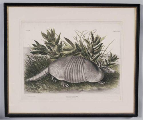 JOHN JAMES AUDUBON Nine Banded Armadillo published by J.T. Bowen 22"x28" lithograph, CONDITION: presents well as framed, but tears, stains and losses at edges of margins, a couple small tear extending inside mat near image.