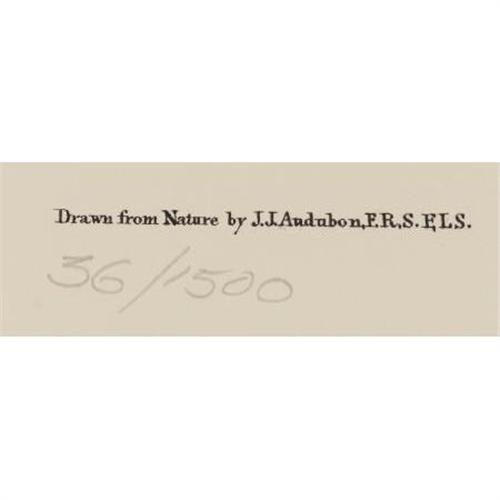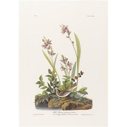 <B>John James Audubon </B></I>(American 1785-1851)<B><BR></B></I><I>Field Sparrow </B></I>(Plate CXXXIX)<BR>Hand colored lithograph<BR>32 x 25.5 inches (81.28 x 64.77 cm)<BR><BR>Based on a painting dated July 11, 1829, the day on which the artist left Great Egg harbor, New Jersey. Audubon wrote of it: "Traveling from Egg Harbor towards Philadelphia, I found a nest of this species placed at the foot of a bush growing in almost pure sand. Near it were the plants which you see accompanying the figure." A pink bill and plain breast are the characteristic field marks of this bird, and the term "field" is a bit misleading as it is rarely seen in cultivated fields, but rather in woodland borders or old pasture lots growing up with weeds and bushes. It is a persistent singer and from a singing perch, usually atop a bush or small tree, it sends forth its clear, sweet and melancholy botes. 4/98 reframed by vineyard .<BR><BR><BR><BR><b>Shipping:</b> Requires 3rd Party Shipping (<a target="_blank" href="http://www.heritageauctions.com/common/shipping.php">view shipping information</a>)
