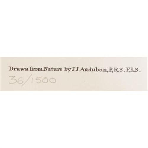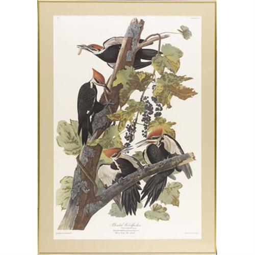 <B>John James Audubon </B></I>(American 1785-1851)<B><BR></B></I><I>Pileated Woodpeckers </B></I>(Plate CXI)<BR>Hand-colored lithograph (Pencil, ink and tempera)<BR>39 x 25.5 inches (99.06 x 25.50 cm)<BR><BR>This plate, a depiction of pileated woodpeckers on branches where vines of fox grapes or red grapes are entwined, is based on painting probably executed in 1829 at Mauch Chunk, Pennsylvania, and considered to be one of Audubon's finest works. He wrote, "When followed (the Pileated Woodpecker) always alights on the tallest branches or trunks of trees removes to the side farthest off, from which it every momeny peeps, as it watches you progress in silence."<BR><BR>Audobon also wrote, "The observation of many years has convinced me, that woodpeckers of all sorts have the bill longer when just fledged than at any future period of their life, and that through use it becomes not only shorter, but also much harder, stronger and sharper."<BR><BR><b>Shipping:</b> Requires 3rd Party Shipping (<a target="_blank" href="http://www.heritageauctions.com/common/shipping.php">view shipping information</a>)