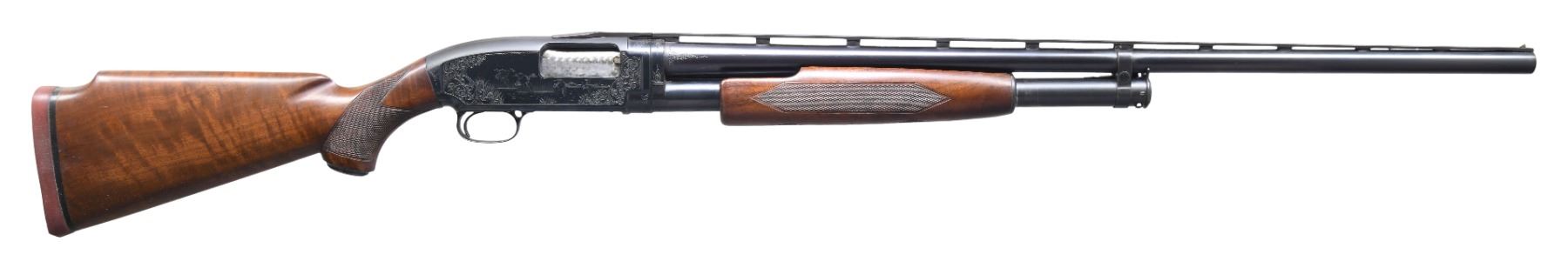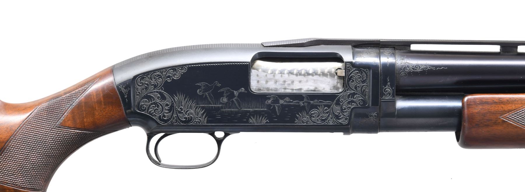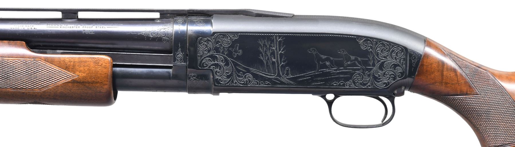 PUMP SHOTGUN. Cal. 12 ga. 2 3/4". S# 1441954. Bbl. 30" w/ milled vent rib & fixed Full choke. White target front sight w/ steel mid bead. Action has No. 5 factory engraving by John Kusmit. Right side marsh scene has four flying ducks. Left side woodland scene shows a flushing partridge & two pointing dogs. Scenes are surrounded by vine type foliate scroll engraving w/ punch dot backgrounds. Complimentary engraving extends to upper & lower receiver areas, trigger guard bow & breech end of bbls. Receiver extension has an engraved pigeon. Jeweled bolt and carrier. Beavertail forearm & Monte Carlo trap dimension stock of nicely grained walnut . The forend has pigeon grade 3 diamond checkering. The stock has standard target checkering. Steel grip cap. LOP: 14" over original solid red Winchester pad. Mfg. 1954. CONDITION: fine original gun retaining 95% original blue, showing slide wear on mag. tube w/ slight edge wear on receiver. Bolt has worn jeweling. Lightly worn original wood finish shows scattered marks & small dents. Toe of rubber buttplate appears to be intentionally rounded. Safety is removed to prevent lost targets. (25-1403/DS). CURIO. $3,000-4,500.
