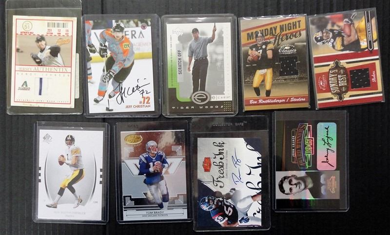 DeMECO RYANS FRESH INK AUTO CARD, BEN ROETHLISBERGER & HINES WARD JERSEY CARDS, TIGER WOODS SCRATCH OFF CARD, RANDY JOHNSON JERSEY CARD, JEFF CHRISTIAN AUTO CARD plus BRADY, ROETHLISBERGER CARDS ESTIMATE $50 -