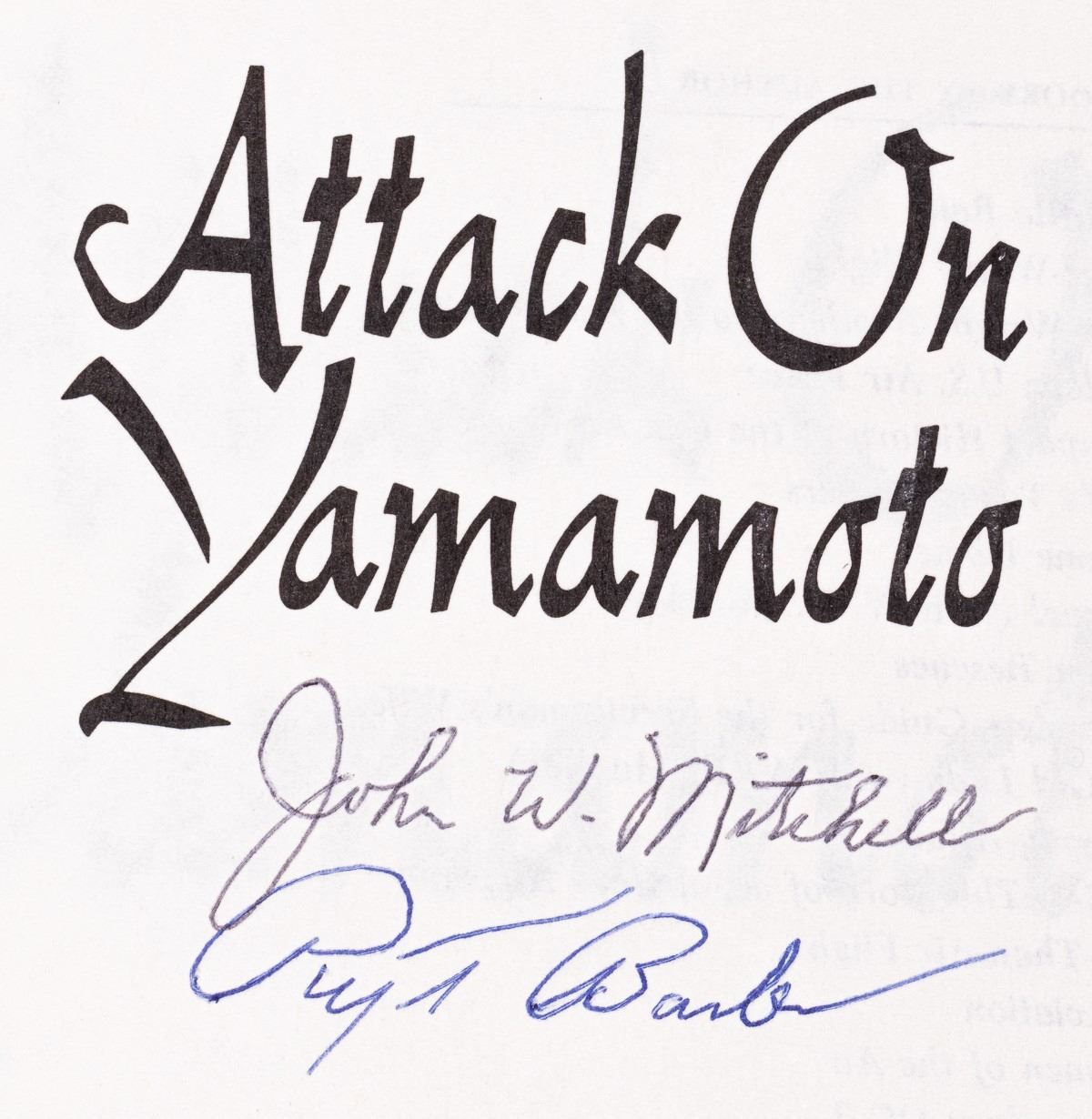 (1914-1995) Mitchell was an officer of the U.S. Air Force and was a flying ace in WWII. (1917-2001) Barber was a Colonel and fighter pilot in WWII. 'Attack on Yamamoto', by Carroll V. Glines, Orion Books, 1990, 240 pages, hardcover, signed by Mitchell and Barber on half-title page, 9.25 x 6.25 inches.