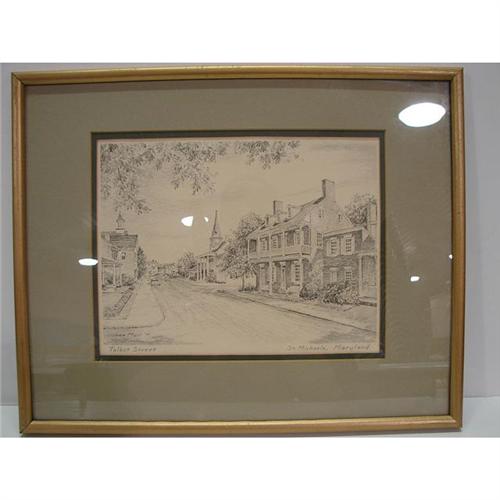 JOHN MOLL MARYLAND PRINT. ‘Talbot Street’. Depicts a scene of Talbot Street in St. Michaels, Maryland. 10” x 13”. Frame: 17” x 21”.