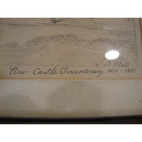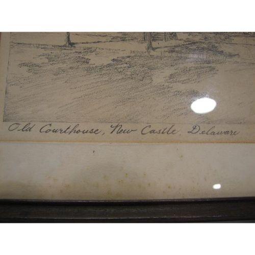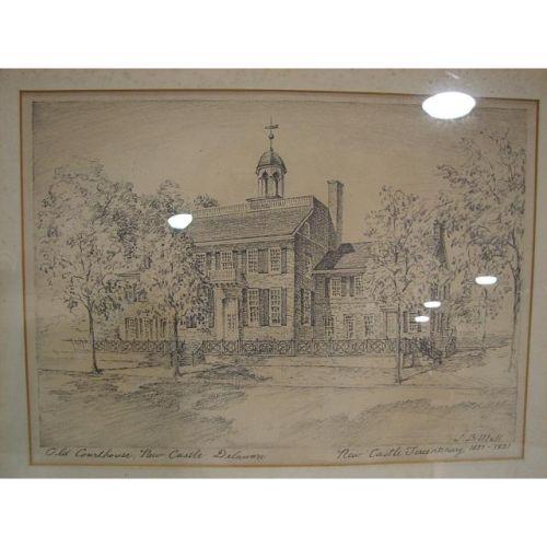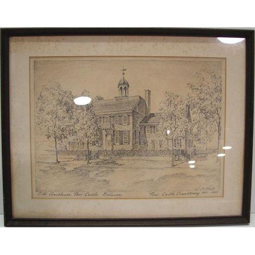 FRAMED JOHN MOLL ORIGINAL SKETCH. Depicts the Old Courthouse, New Castle, Delaware. Moll completed the sketch for the New Castle Tercentenary in 1951. Text at bottom reads “Old Courthouse, New Castle, Delaware/New Castle Tercentenary 1651-1951”. Signed at lower right. Framed, matted under glass. 12.5” x 16” framed. From the Estate of Delaware Governor & Mrs. Elbert Nostrand Carvel (Governor of Delaware, 1949-1953, 1961-1965).