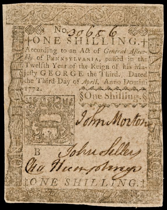 Fr. PA-154. Pennsylvania. April 3, 1772. One Shilling. Plate B. Signed by “John Morton,” Conservation. Choice Very Fine. Strong bold brown signature “John Morton” at top of the three signatures. This note also strongly Signed by “John Sellers” and “Charles Humphreys.” Humphreys was a member of the Pennsylvania Provincial Congress (1764-1774) and served as a Member of the First Continental Congress (1774-1776), but he actually Voted Against the Declaration of Independence because as a practicing Quaker he was opposed to any act that would escalate violence in the American Revolutionary War with England and withdrew himself from the Congress soon afterward. This note is well centered and quite even and clean in appearance having a deft sealed centerfold edge split. This is a historically important piece of Pennsylvania and American history, having bold signatures of both “John Morton” a Signer of the Declaration of Independence and Continental Congressman “Charles Humphreys,” who famously voted against it!
