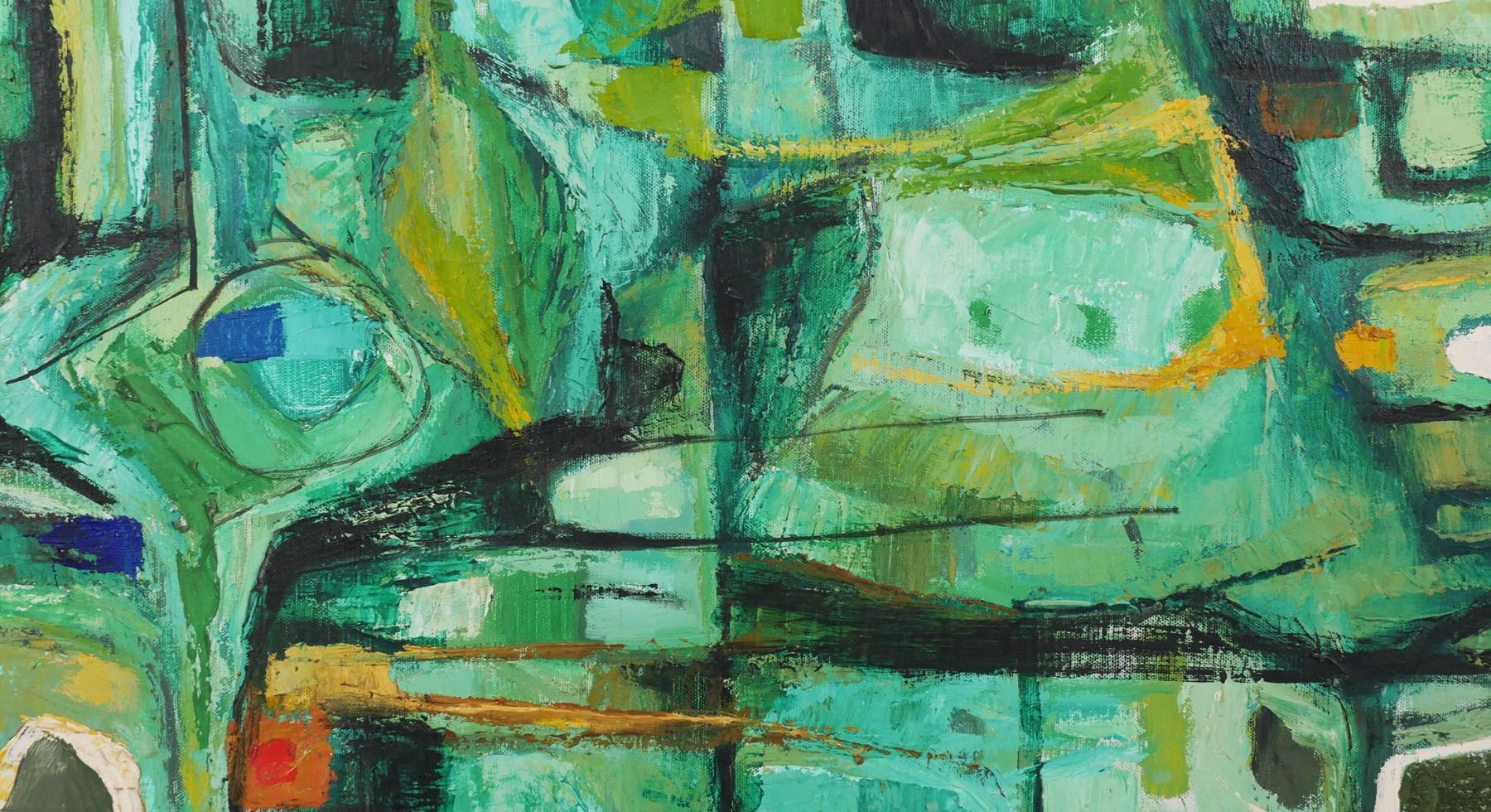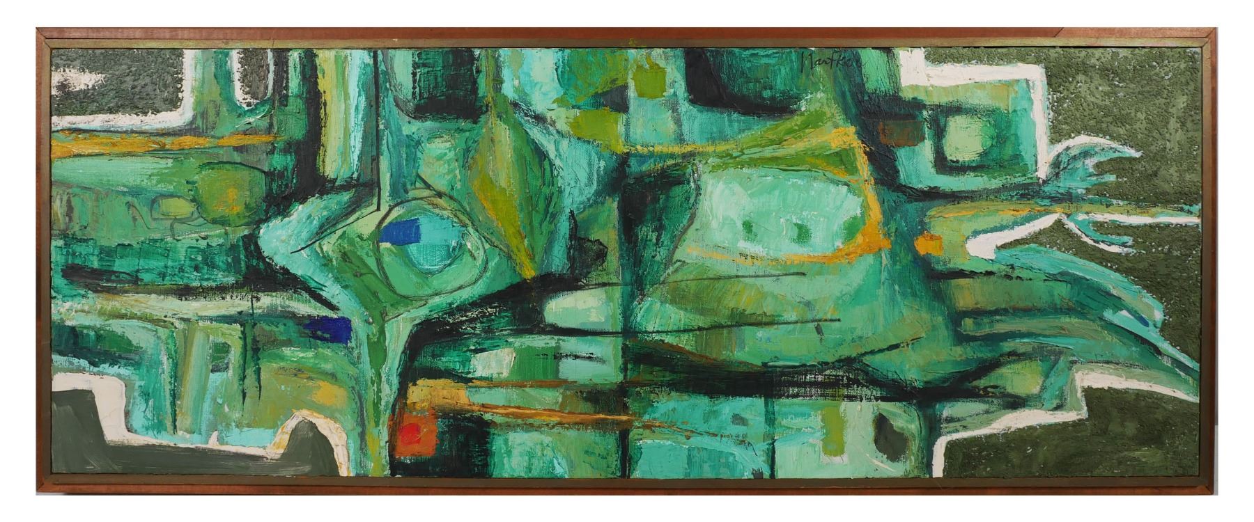 JOHN NARTKER (American, 1930-1998) Abstract oil on canvas in vivid greens and yellows. Signed at top edge. Overall size is 36" x 15". Excellent condition. Artist bio card attached verso.