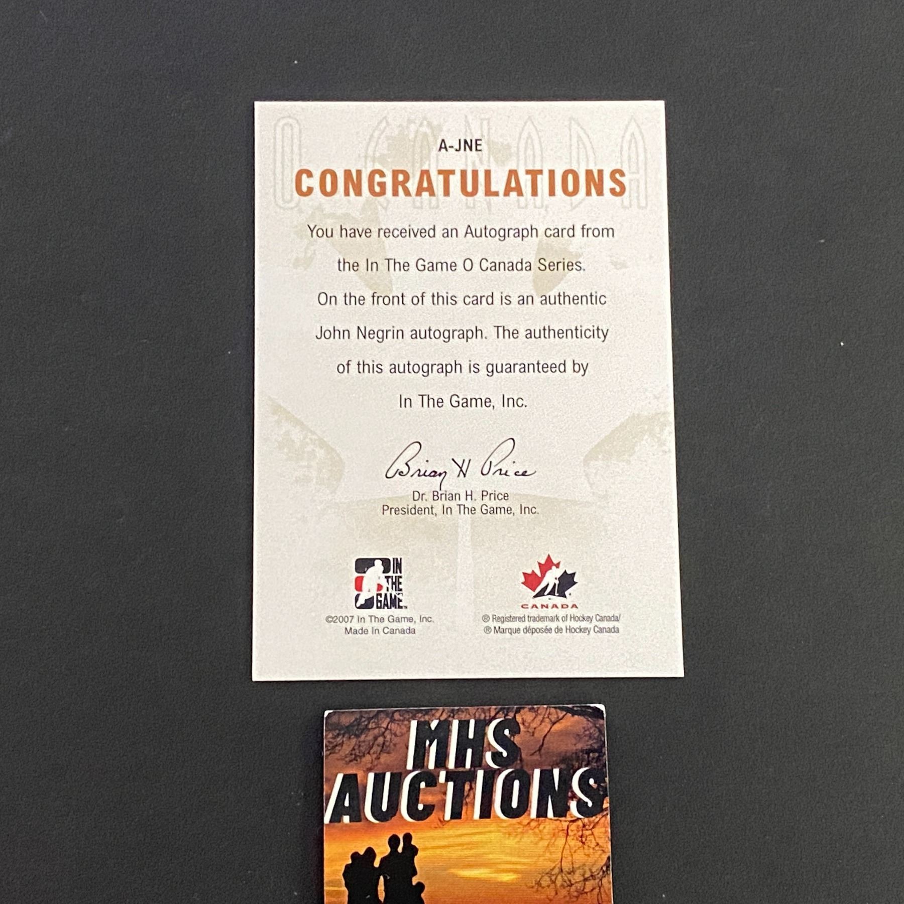 JOHN NEGRIN 2007 IN THE GAME AUTOGRAPH HOCKEY CARD