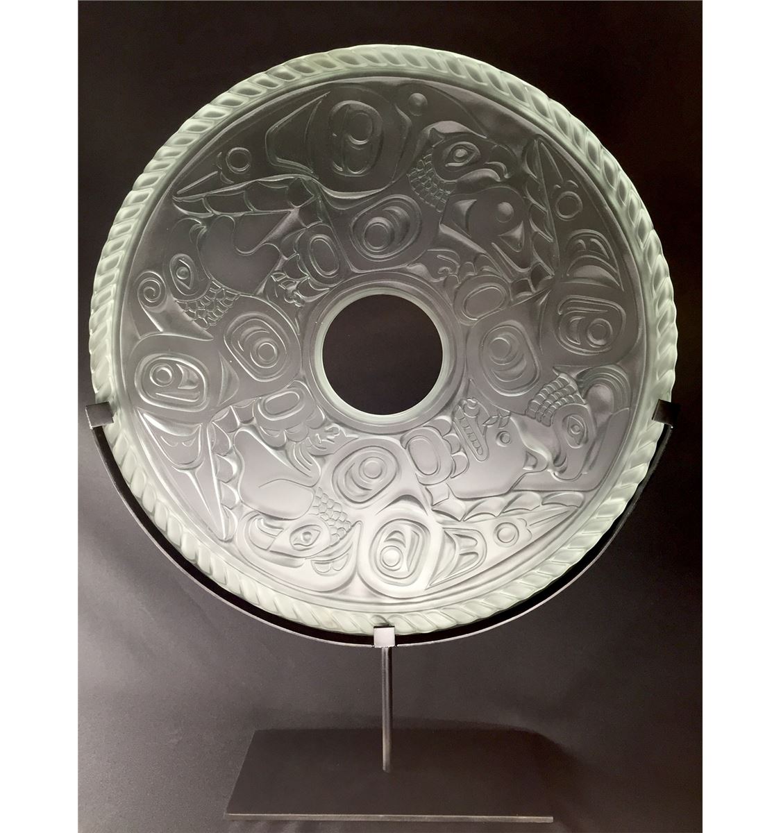 JOHN NUTTER, SANDBLASTED GLASS PANEL, 20" DIAMETER, FEATURING EDENSHAW IMAGERY ON PAINTED STEEL BASE