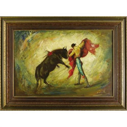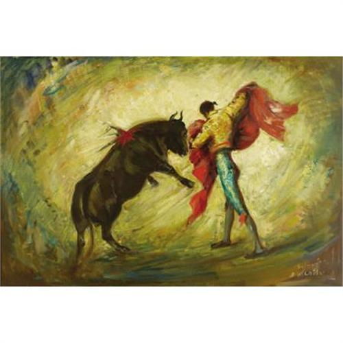 <B>JOHN ORTH (1889-1976)</B></I><BR><I>Belmonte</B></I><BR>Oil on canvas<BR>24 x 36 inches (61.0 x 91.4 cm)<BR>Signed and titled lower right<BR><BR> The modern style of Spanish bullfighting is credited to Juan Belmonte, generally considered the finest matador of all time. Belmonte introduced a daring and revolutionary style, in which he stayed within a few inches of the bull throughout the fight. Although extremely dangerous (Belmonte was gored on many occasions), his style is still considered the ideal by most matadors. In this painting, Belmonte executes one of his signature passes.<BR><BR>Provenance:<BR>Estate of John Orth<B>Condition Report:</B> Excellent condition. Period frame in excellent condition.<BR><BR><b>Shipping:</b> Requires 3rd Party Shipping (<a target="_blank" href="http://www.heritageauctions.com/common/shipping.php">view shipping information</a>)