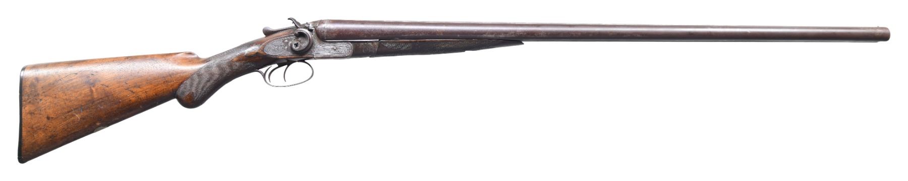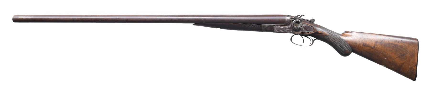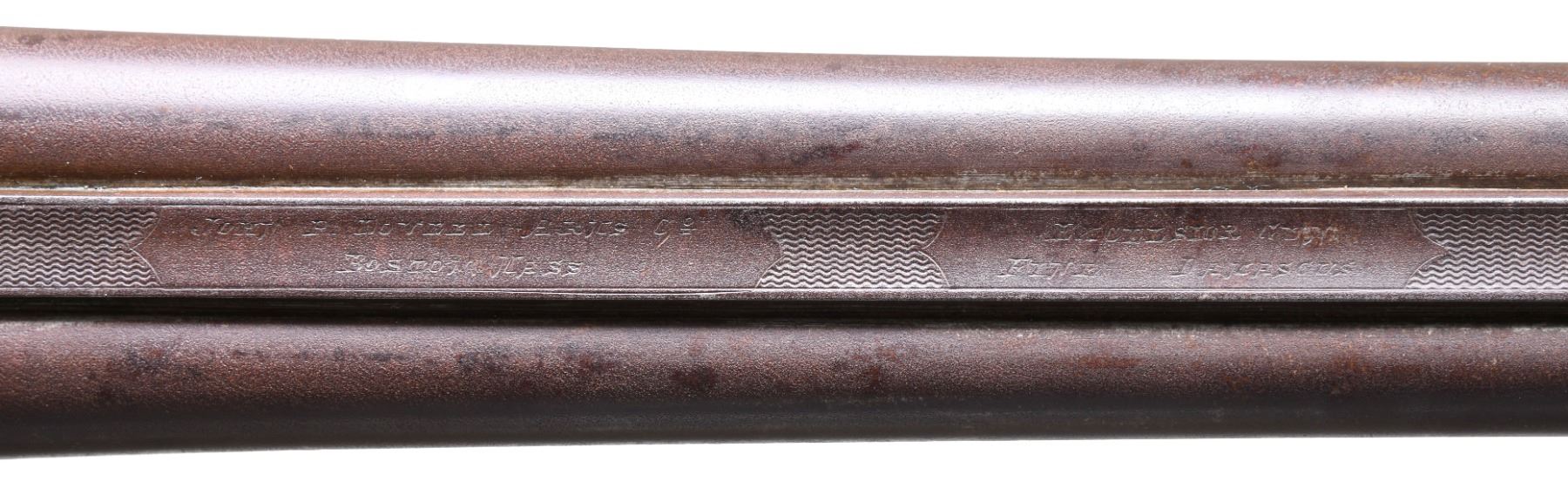 SXS HAMMER SHOTGUN. Cal. 12 Ga., 2 5/8". S# 38112. Birmingham made gun with pre 1896 Birmingham proofs on water table, retailed by John P Lovell Arms Co. The Damascus 30" barrels have matted rib with address & brass bead; fixed Full & IC. chokes. Receiver has Birmingham proofs on water table with sprays of acanthus scroll throughout. Locks are stamped "JOHN P LOVELL ARMS CO BOSTON" with engraved of pheasant scenes. Action features double triggers, crossbolt fastener & extractors. Walnut splinter forearm with Deeley release & pointer pattern checkering. Round knob pistol grip buttstock with checkering & German silver nameplate on toeline. LOP: 13 1/8" to highly figured hard rubber buttplate showing woodland elk & doe scene. CONDITION: metal has dark brown patina with spots of corrosion throughout. Splinter forearm heavily worn with chip on left barrel channel & extra varnish applied. Wood heavily worn around checkering with epoxy repair behind left lock, numerous dings & marks along with scattered small cracks. Buttplate has crack near toe. Bores show pitting & sm. dents. Right lock hammer missing screw, both firing pins missing bushing. (01-26846/MD). ANTIQUE. $200-400.