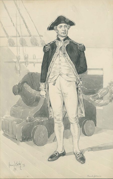 HERMANN DUDLY MURPHY - (1867-1945) American painter and illustrator. An original ink and gray wash drawing of John Paul Jones standing full-length on the deck of a ship accomplished for the inclusion in the 1893 juvenile biography, Paul Jones by Molly Elliot Sewell. Signed "Hermann D. Murphy 93 at lower left. Lightly toned margins, with minor soiling, mounting remnants on verso, otherwise good condition.
