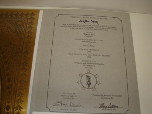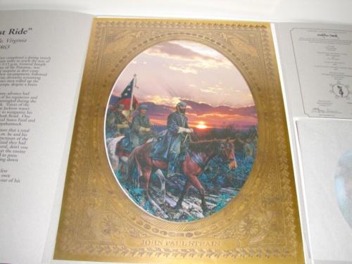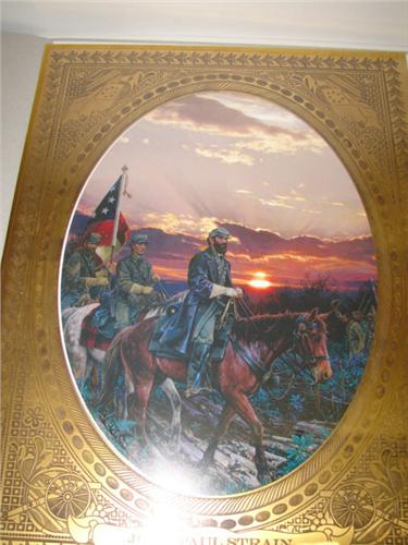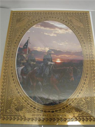 JOHN PAUL STRAIN “THE LAST RIDE” ARTIST PROOF PRINT OF STONEWALL JACKSON. Depicts Jackson at Chancellorsville, Virginia riding his horse, Little Sorrell, at sunset, just a few hours before he was mortally wounded. Print is accompanied with folder, matting, and a small print of Jackson. Only 75 Artist Proofs were made of this work by Strain. 11.75” x 15.5” unframed.