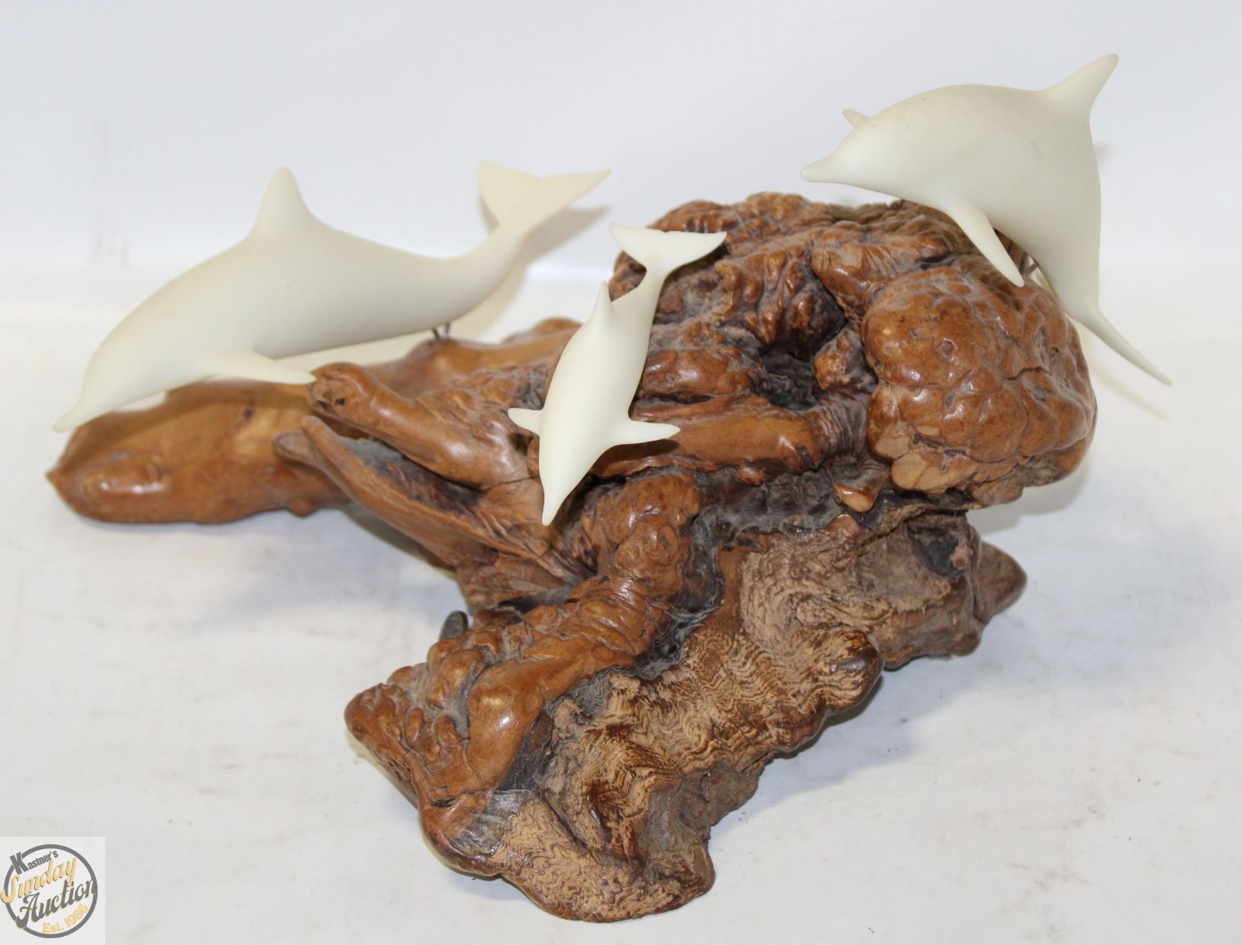 JOHN PERRY DOLPHIN SCULPTURE ON BURL WOOD