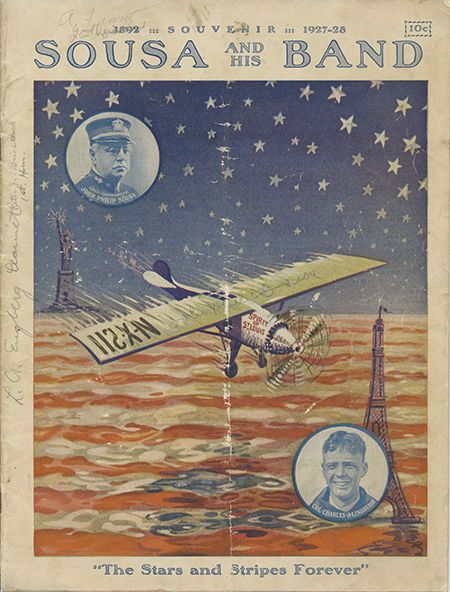 (1854 -1932) "The March King", American bandmaster and composer of over 140 military marches. Signed printed 1927 program "Sousa and His Band", approx. 18pp. 4to., contains photos of Sousa, a facsimile of his score "The Stars and Stripes Forever", ads, etc., the cover taking advantage of Charles Lindbergh's trans-Atlantic flight. Signed in pencil across the plane's wing by Sousa with fair contrast and one letter worn-off by scuff, also signed by three band members. Sold with an early 2 1/2" x 3 1/2" photo of the bandleader with facsimile signature at bottom. Two pieces.
