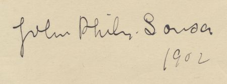 (1854-1932) "The March King", American bandmaster and composer of over 140 military marches. Bols signature adding 1902, penned on a small card. Light mounting traces to verso, very good. Ideal for display.