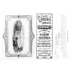 <b>422. JOHN PIERPONT MORGAN</b> (1837 - 1913)<b> </b>American banker and financier who founded J.P. Morgan & Co., reorganized American railroads and founded U.S. Steel. partly-printed D.S. "<i>J. Pierpont Morgan</i>" 1p. folio, New York, 1866, a $1000 first mortgage bond issued by the New Jersey Junction Railroad Co. and guaranteed by the New York Central and Hudson River Railroad Co., co-signed by Morgan's partner <b>HARRIS C. FAHNSTOCK</b>. Matted with a vintage photo of a locomotive and a copy of a portrait of Morgan, set into a somewhat-scuffed frame. Very good condition. Unexamined out of frame.<b> $500-700</b>
