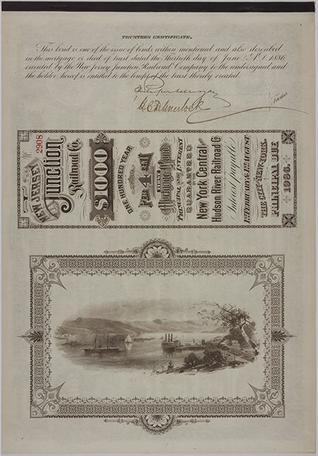 (1837 - 1913) American banker and financier who founded J.P. Morgan & Co., reorganized American railroads and founded U.S. Steel. Partly-printed D.S., 6pp. folio, [New York] June 30, 1886, a $1000, 4% 100-year mortgage bond for the New Jersey Junction Railroad Co. Morgan signs the verso of the certificate as a trustee together with HENRY C. FAHNESTOCK. The bond includes all but one of the $20 redemption coupons and are neatly attached to the certificate at one margin. A superb example of the work of the American Bank Note Company with an ornate border and vignette of a harbor scene and another larger engraving of the Hudson Valley with steamships and railroads in view. Fine condition.