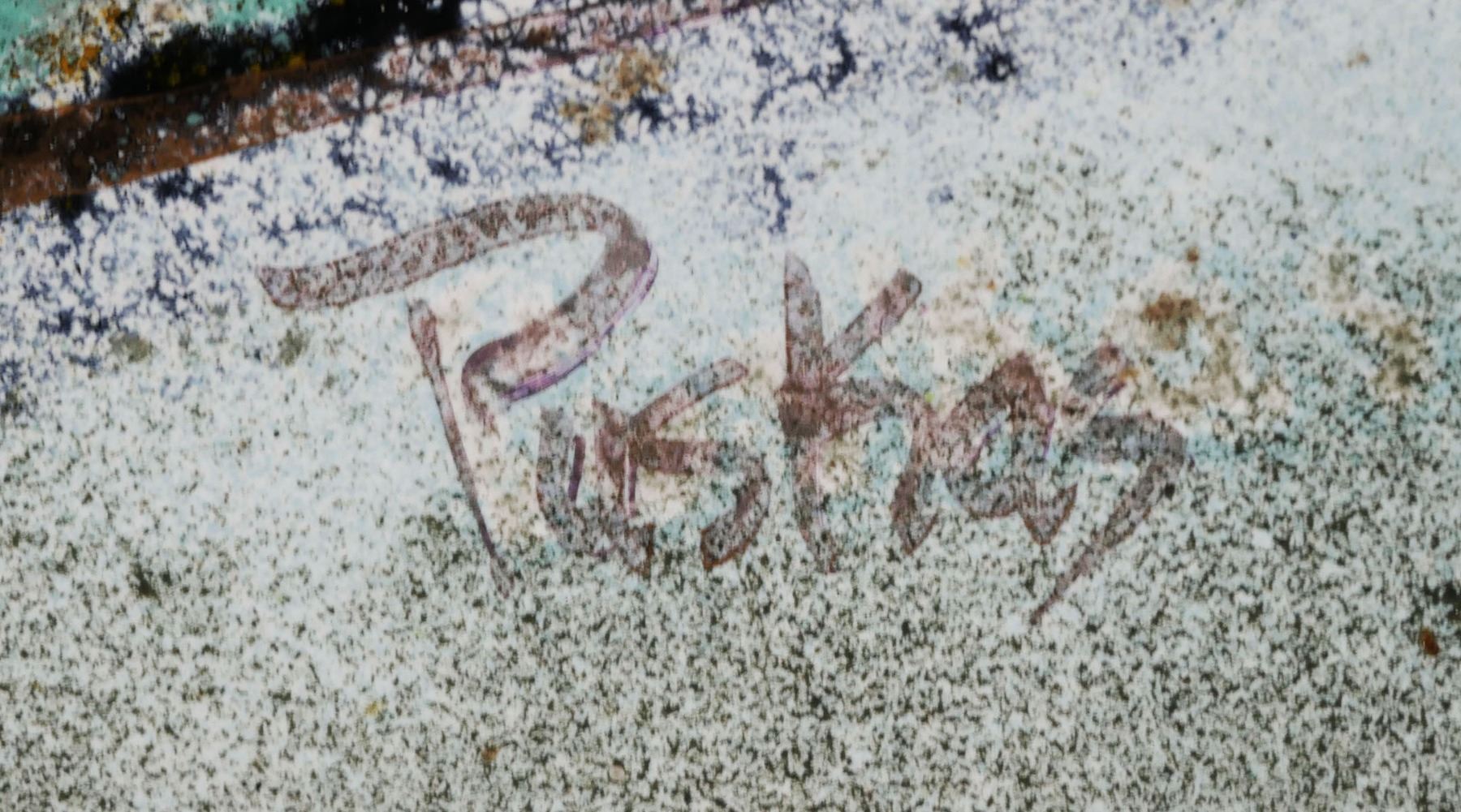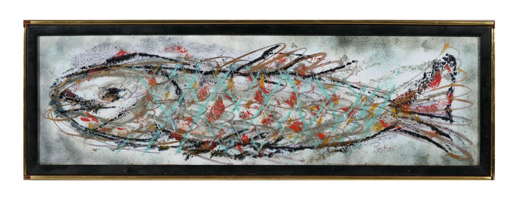 Large enamel on copper image of a fish by John Puskas (American 1917-2001). Overall size is 36" x 12". Very good condition with wear to framing.