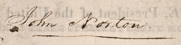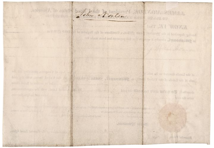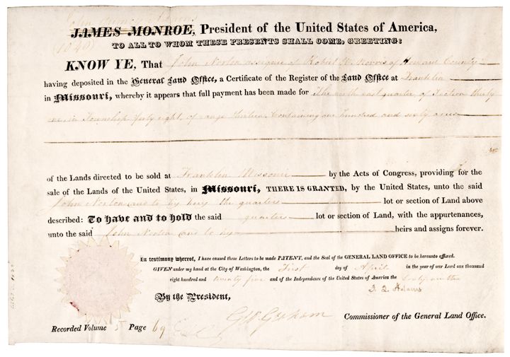 April 1, 1825-Dated, Rare “Re-use” Partly-Printed Document, being “JAMES MONROE” Headed, yet Signed, “J. Q. Adams” as President, 1 page, 13.25” x 9.25” upon Vellum, Washington(DC), Very Fine. This original 1825 Land Grant is made to John Norton, assignee of Robert W. Norris of Howard County, purchased at Franklin, Missouri. This very rare use printed Document was printed with “James Monroe,” Adams predecessor, as President, at top. Monroe’s name was crossed out and “John Quincy Adams” was penned above. Also Signed by Commissioner of the General Land Office, George Graham. Well printed with typical folds and minor soiling, manuscript portions fully readable though somewhat light. The White Paper and Wax Embossed Official Seal is fully intact at the lower left, with a nice clear deeper brown “J. Q. Adams” signature at the lower right.