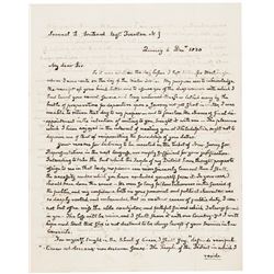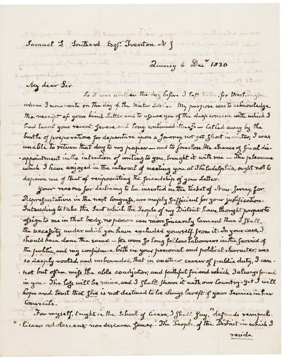 December 6, 1830-Dated, Exceptional Political Content Autograph Letter Signed, “J. Q. Adams”, 3 pages, measuring 8” x 10”, Quincy, Massachusetts, Very Choice Crisp Extremely Fine. Bright and fresh, being very boldly written in deep rich brown ink upon excellent quality period laid paper. J. Q. Adams evokes the names of former Presidents, “...Washington accepted a military commission from his successor - Jefferson while he lived was the Rector of his own University - my father, Madison, and Monroe...”. This superb content and physical gorgeous superb quality Letter is written to former Senator Samuel L. Southard (1787-1842) of Trenton, New Jersey, who was then serving as Attorney General for the State of New Jersey. Two years later, Southard would be elected Governor of New Jersey, in which office he would serve just one year before resigning to fill a vacancy in the United States Senate. Here, John Quincy Adams writes, in full: