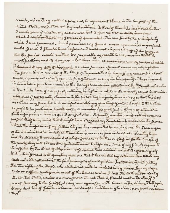 For myself, taught in the School of Cicero, I shall say, 'defendi rempulicam adolescens, non disiram genex.' The People of the District in which I reside, when they called upon me to represent them in the Congress of the United States, consulted not my inclinations - To those of them who enquired better I would serve if elected, my answer was that I saw no warrantable ground upon which I could withhold my services if demanded. This was strictly the principle by which I was governed. Had I perceived any sound reason upon which my refusal could stand I should have refused. I could not disguise to myself the prospect that the service would neither be personally agreeable to me, nor without the mortification and its dangers - But there were considerations namely personal, which I deemed it my duty to disregard. A motive far more efficient caused my only hesitation - The service that a member of the House of Representatives in Congress can render to his Constituents, depends not entirely upon his dispositions, or even upon his capacity. There is much in his relative position - much in the feelings towards him entertained by those with whom he is to act - In times of warm party collusion, his influence while in the minority cannot be considerable, and if personally obvious to the prevailing majority, there is danger that his best exertions may serve but to draw defeat and obliging upon himself, without benefit to the nations or profit to his particular constituents. A member less qualified in other respects, will in such cases prove a more useful Representative - So possibly does this consideration even here present itself to my mind that it might have staggered my Resolution to undertake the service which the confidence of my fellow Citizens has committed to me, had not the Scavingers of the Administration indulged themselves in [?] from individuals whom they have had the delicacy to name, and of whose services as bullies or assassins for the benefit of the party they hold themselves quite authorised to dispose. Some of my friends appear to be affected by this threat of Algerine warfare, and have advised me not to expose myself to it - So different is its operation upon me that it has riveted my determination to take my seat. I will not distrust the feint principles of our Republican Institution, by stipulating that the rights of the People who elected me will be violated in my person by any desperado or ruffian partizan in or out of the house; and as I took the Oath of President of the United States, under an anonymous threat that I should meet a Brutus, if I went that day to the Capitol, I may now again say with Cicero in the divine Philippiie, to any dark hint of future violence 'contempsi catilinas gladios; non partinescam tuoi'. With regard to the general principle, it is my deliberate and well considered opinion that the discharge of the Office of President of the United States ought not in our Country to operate either as exclusion or exemption from the subsequent performance of service in either branch of the Legislature. There has indeed been hitherto no example of this, and one of my motives for consenting to serve has been, to get the example which I consider so eminently congenial to the Spirit of Republican Government, and which I cherish the hope will be followed by results signally useful to our Country - Washington accepted a military commission from his successor - Jefferson while he lived was the Rector of his own University - my father, Madison, and Monroe, served in Convention of fundamental legislation in their respective States - Had every one of them after the termination of their functions in the first executive office of the Union, gone through a term of Service in either house of Congress, the Country might now be reaping a harvest of their Labour the worth of which may be estimated by that which she has derived from their actual devotion to her cause and welfare.