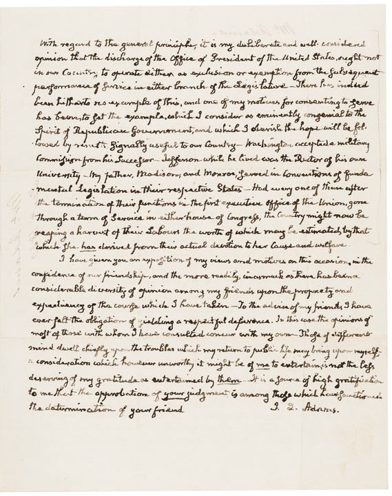 I have given you an exposition of my views and motives on this occasion, in the confidence of our friendship, and the more readily, inasmuch as there has been a considerable diversity of opinion among my friends upon the propriety and expediency of the cause which I have taken - To the advice of my friends I have ever held the obligation of yielding a respectful deference. In this case the opinions of most of those with whom I have consulted concur with my own - Those of different mind dwell chiefly upon the troubles which my return to public life may bring upon myself, a consideration which however unworthy it might be of me to entertain, is not the less deserving of my gratitude as entertained by them - It is a source of high gratification to me that the approbation of your judgment is among those which have sanctioned the determination of your friend --- (Signed) J. Q. Adams.”